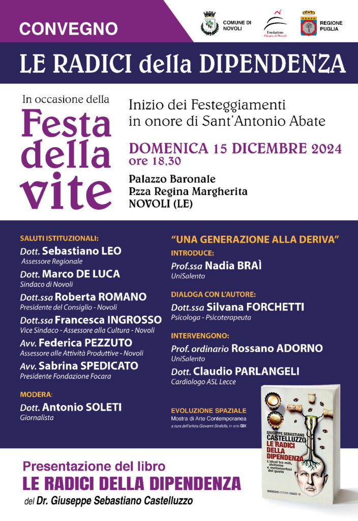 In serata, invece, nelle sale dell’antico Palazzo Baronale in piazza Regina Margherita, la presentazione del libro di Giuseppe Sebastiano Castelluzzo, “Le radici della dipendenza – L’alcol tra miti, alchimie e metamorfosi del gusto”. Oltre alla presenza dell’autore, sono previsti anche gli interventi di Nadia Braì e Rossano Adorno (Docenti UniSalento), Silvana Forchetti (Psicologa e Psicoterapeuta) e Claudio Parlangeli (Cardiologo). Interverranno, per un indirizzo di saluto, l’assessore regionale Sebastiano Leo, il Sindaco di Novoli, Marco De Luca, la Presidente del Consiglio Comunale, Roberta Romano, l’assessore alla cultura del Comune di Novoli, Francesca Ingrosso, l’assessore alle attività produttive del Comune di Novoli, Federica Pezzuto e la presidente della Fondazione Fòcara di Novoli, Sabrina Spedicato. Modera il giornalista Antonio Soleti.