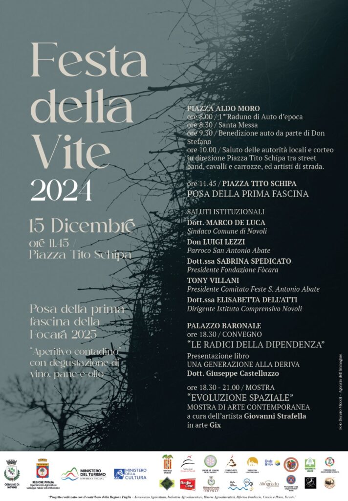 Si terrà domenica 15 dicembre 2024, a Novoli, la Festa della Vite, l’ormai tradizionale appuntamento che avvia, ufficialmente, i “motori” della complessa macchina organizzativa in vista della festa patronale in onore di Sant’Antonio Abate e la realizzazione della Fòcara, un imponente monumento di arte contadina sapientemente costruito da mani esperte con l’apporto di decine di volontari e l’impiego di migliaia di fascine di tralci di vite recuperati dalla rimonda dei vigneti.