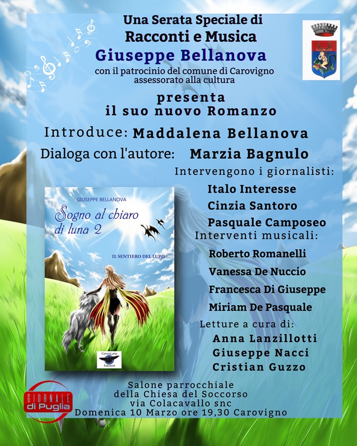 Proseguono gli eventi culturali nella città di Carovigno: domenica 10 marzo alle ore 19:30 presso il Salone Parrocchiale della Chiesa del Soccorso in via Colacavallo snc, si terrà la presentazione del nuovo romanzo di Giuseppe Bellanova dal titolo “Sogno al Chiaro di Luna 2 – Il Sentiero del Lupo”. Si tratta di una serata speciale di racconti musica con il patrocinio del Comune di Carovigno Assessorato alla Cultura.
