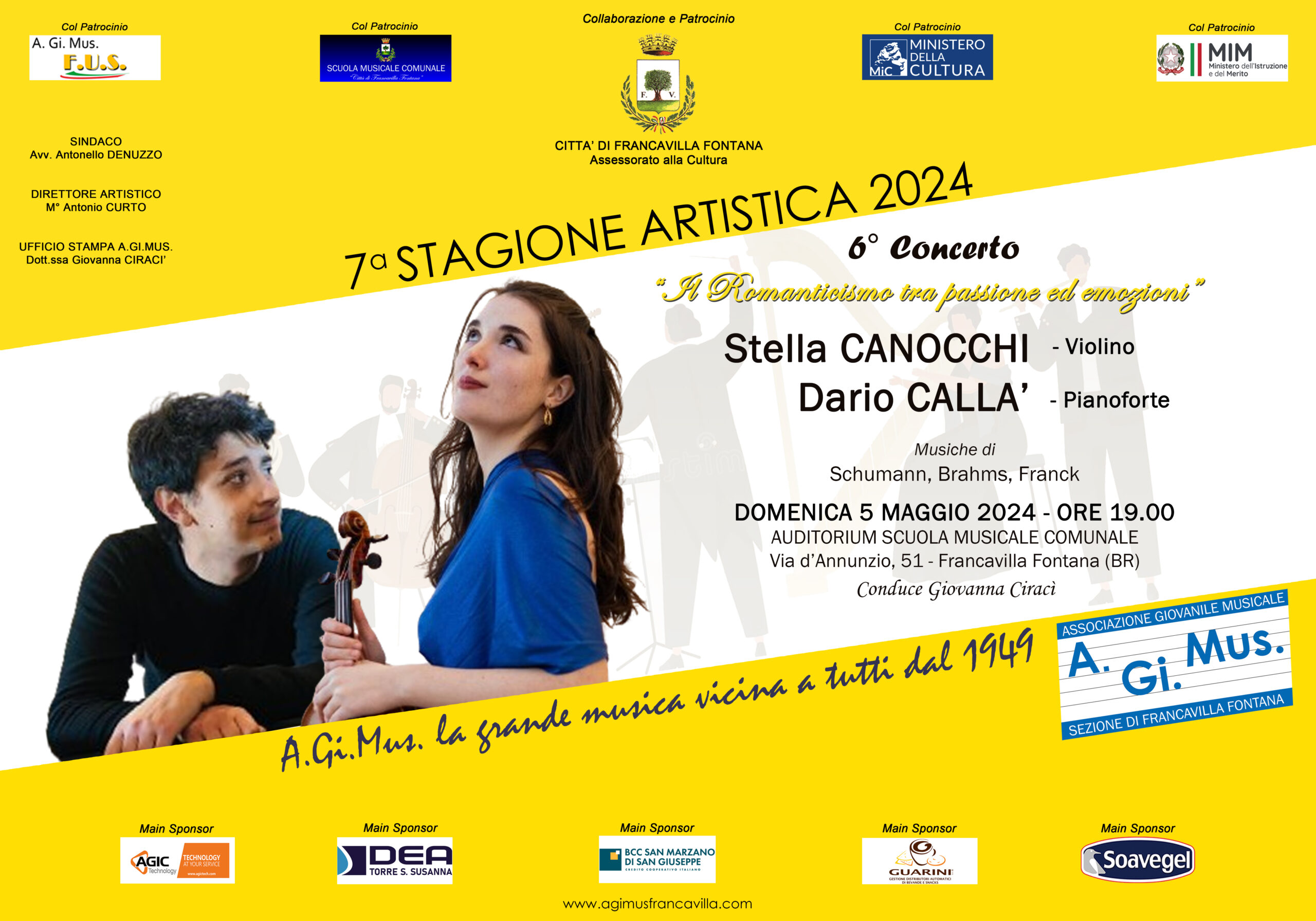 Si terrà, domenica 5 maggio, alle 19.00, presso l’Auditorium della Scuola Musicale Comunale di Francavilla Fontana, il sesto appuntamento della Stagione Artistica organizzata dall’Associazione A.Gi.Mus. di Francavilla Fontana e dall’Associazione Auditorium di Castellana Grotte, sotto la direzione artistica dei maestri Pierluigi Camicia e Antonio Curto, e dal Comune di Francavilla Fontana. In programma il concerto “Il romanticismo tra passione ed emozioni” eseguito dal duo formato dalla violinista Stella Canocchi e dal pianista Dario Callà che eseguiranno per l’occasione musiche di Brahms, Schumann e Franck.