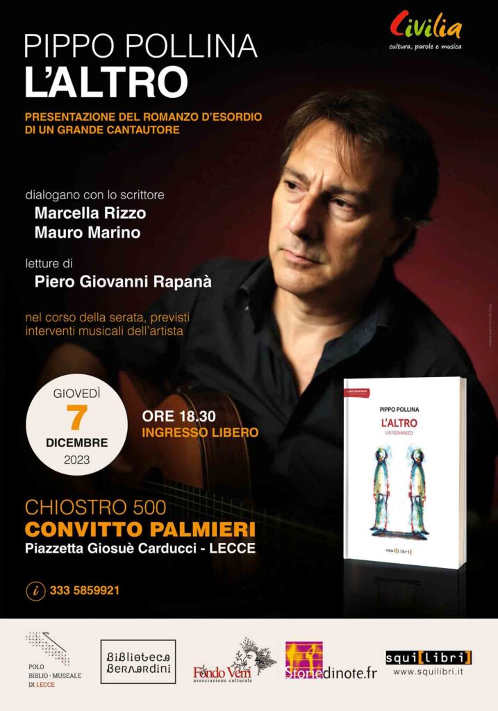 Prosegue il tour di presentazioni del romanzo “L’altro” di Pippo Pollina. Dopo Crotone, il cantautore siciliano arriva a Lecce, alla Biblioteca Bernardini, ex Convitto Palmieri, dove il 7 dicembre 2023, ore 18:30 (con ingresso libero) presenterà il suo libro dialogando con Marcella Rizzo e Mauro Marino. L’evento è organizzato dall’associazione culturale “Civilia –cultura, parole e musica” e patrocinato dal Polo Biblio Museale di Lecce, l’associazione culturale Fondo Verri e la casa discografica Storiedinote.fr.