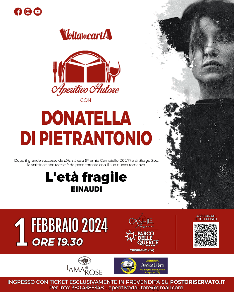Con la sua scrittura scabra, vibratile e profonda, capace di far sentire il peso di un’occhiata e il suono di una domanda senza risposta, l’autrice Premio Campiello (con L’Arminuta) e finalista allo Strega (con Borgo Sud) tocca in questo libro una tensione tutta nuova. A dialogare con lei ci sarà il giornalista Vincenzo Parabita. Per la scrittrice abruzzese si tratta dell’unica data a Taranto e provincia, nonché una delle poche in Puglia. Come consuetudine di Aperitivo d’Autore, la serata verrà aperta da un gustoso aperitivo, stavolta realizzato dalla cucina della struttura e abbinato ai vini a chilometro zero di Cantina Lama di Rose.