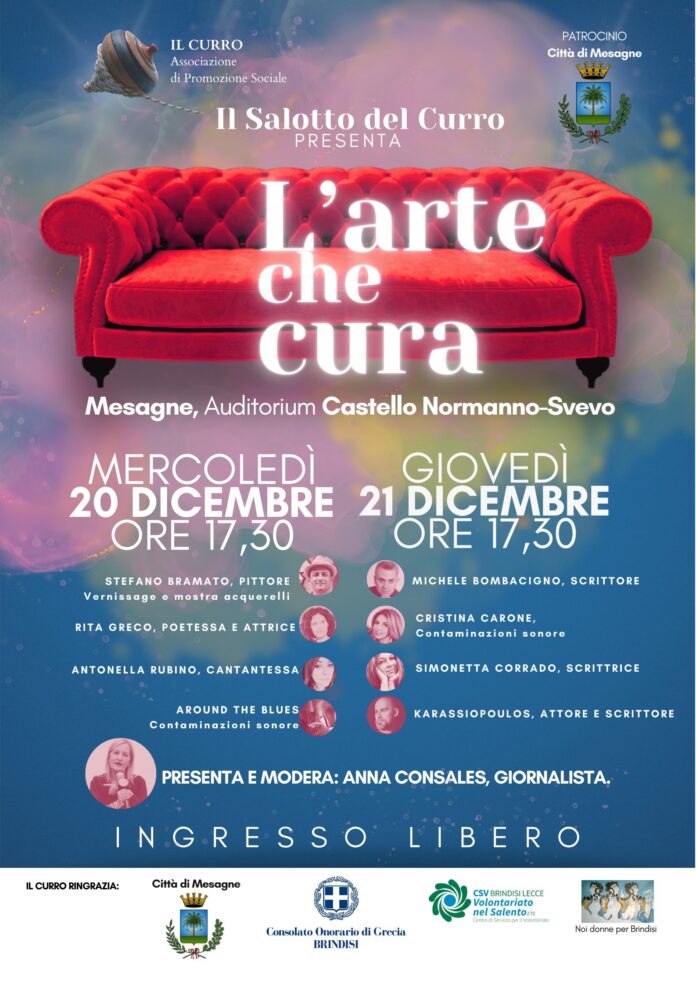Il 20 e il 21 dicembre alle ore 17:30, presso l’Auditorium del Castello Normanno-Svevo di Mesagne, Il salotto del Curro, con il patrocinio del Comune di Mesagne, in collaborazione con il Consolato Onorario di Grecia- Brindisi, CSV Brindisi-Lecce/Volontariato nel Salento e Noi Donne per Brindisi, accoglie l’evento a ingresso gratuito “L’arte che cura”, una manifestazione che si ispira ad una frase di Georges Braque, artista del XX secolo: “L’arte è una ferita che si trasforma in luce”.