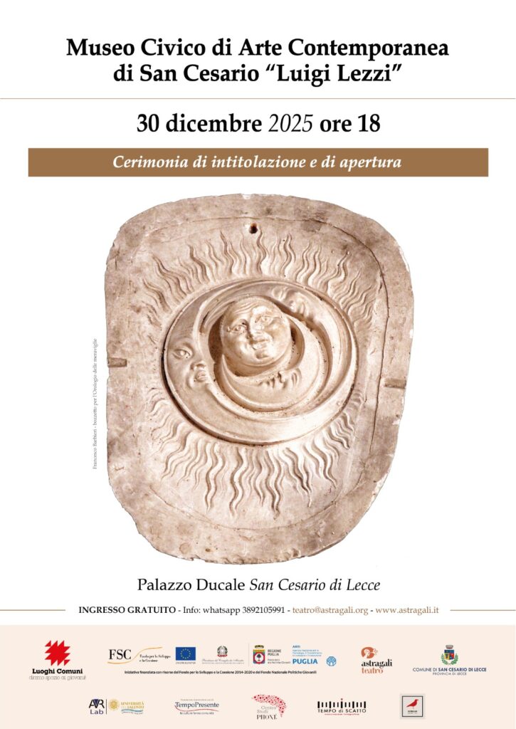 Si apre una nuova stagione per il Museo Civico di San Cesario di Lecce, attraverso una tappa fondamentale del progetto “Da qui si vede tutta la città” di Astràgali Teatro. Martedì 30 dicembre, alle ore 18, nel Palazzo Ducale dove il Museo è ubicato, è prevista l’apertura al pubblico del nuovo allestimento della collezione permanente, curata dai direttori artistici Carmelo Cipriani e Fabio Tolledi. Nella stessa occasione si tiene la Cerimonia di intitolazione a Luigi Lezzi, avvocato e già stimato Sindaco del paese, rimasto nella memoria collettiva per l’impronta del cambiamento lasciata nella sua comunità attraverso opere pubbliche e iniziative culturali. Intervengono il Sindaco di San Cesario di Lecce Giuseppe Distante, l’assessore alla Cultura Anna Luperto e i direttori artistici.