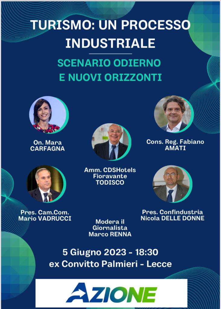 L’evento si svolgerà il 5 giugno alle ore 18:30 presso la sala Teatrino dell’ex Convitto Palmieri, con il giornalista Marco Renna che dialogherà con l’On. Mara Carfagna ed il Consigliere Regionale Fabiano Amati e con eccellenze del settore, come l’Amministratore Unico di CDSHotels Fioravante Todisco, il Presidente della Camera di Commercio di Lecce, Mario Vadrucci, ed il Presidente di Confindustria Lecce, Nicola delle Donne.